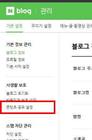 네이버 블로그 관리페이지에 접속한 후 "콘텐츠 공유 설정" 메뉴를 클릭합니다.